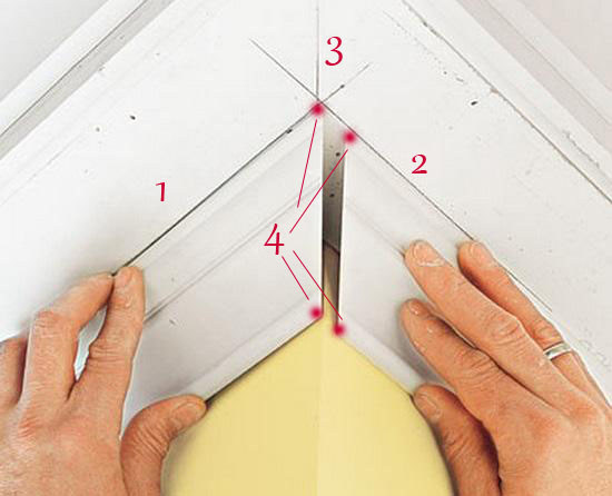 Алгоритм приклеивания плинтуса по месту следующий. ...прикладываем первоначально первый плинтус и обводим его контур на потолке. Затем прикладываем второй, и также маркируем его профиль. Далее по точке схождения контуров, то есть где перекрещиваются прямые, делаем маркировку для реза плинтуса. При этом второй точкой для реза будет угол стены. Осталось лишь выдержать угол, и можно приклеивать плинтуса на место.