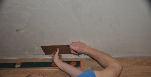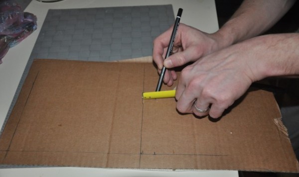 После, из картона вырезаем шаблон этого самого кирпича. Именно он и будет использован для нанесения маркировки, разлиновки на стену.