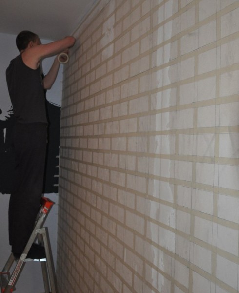 Разлиновываем всю стену. Да, здесь важным моментом будет предварительно купить малярный скотч, и разлиновать стену таким образом, чтобы ширина швов между нашими кирпичиками, соответствовала ширине малярного скотча. Именно его и необходимо будет наклеить на место швов кирпичной кладки.
