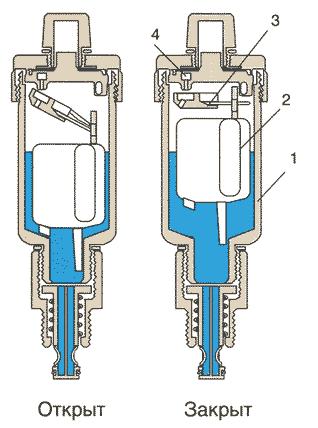 Принцип его работы следующий. Когда воздух начинает скапливаться под запорным клапаном, то поплавок, который обеспечивает закрытия этого самого клапана, начинает тонуть, так как плавает в теплоносителе, уровень которого соответственно с появлением воздушной пробки начинает снижаться. В итоге, клапан открывается и воздушная пробка выходит из системы. Уровень теплоносителя вновь повышается, поплавок всплывает, и клапан перекрывает протечки теплоносителя во внешнюю среду.