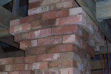 Итак, разделка выполняется по нарастающей, если так можно сказть. Примерно за три ряда кирпичей начинает увеличиваться консольная часть разделки трубы, для того, чтобы в месте прохождения через перекрытие обеспечить низкие температуры нагрева на само трубе. Затем укладываются ряды равные по высоте перекрытию и утеплителю.
