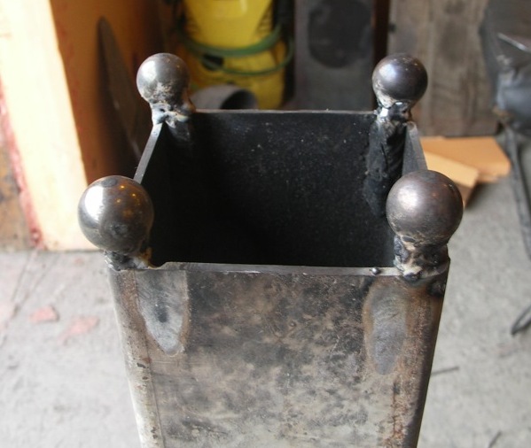 Привариваем площадку для установки нагреваемой емкости или как в нашем случае "пальцы" от шаровых опор. Здесь надо понять на какой точно высоте выставить площадку, чтобы обеспечить хороший КПД. Если площадка будет слишком высоко, то толку с такой печки будет немного. Именно поэтому лучше первоначально поэксперементируйте, а потом приварите площадку окончательно.