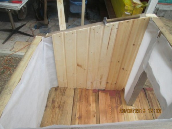 Первоначально делаем каркас из бруса. Верх и низ зашиваем досками, можно б/у. При этом используем парозащитную пленку.