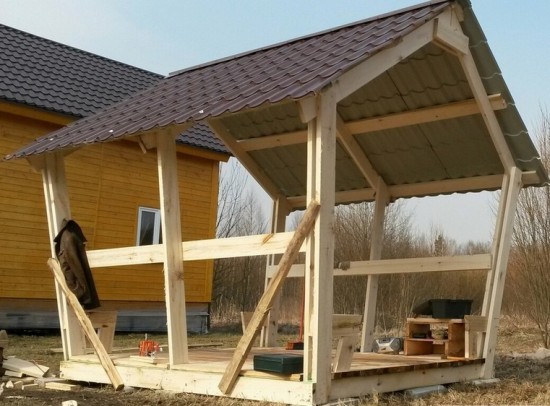 Для усиления несущей способности беседки, между нижним брусом и перилами, и между перилами и стропилами, устанавливаются дополнительные столбики. Также укрепляется и вход. Результат таков.