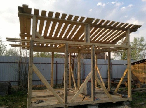 Начинаем возводить каркас для стен и крыши. Выставляем брус и раскрепляем его укосинами.