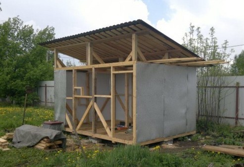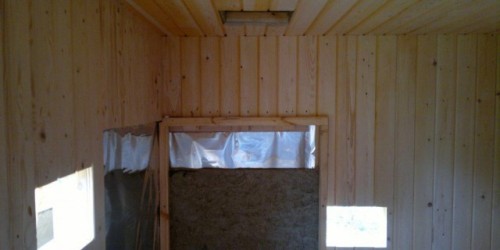 Обшиваем стены вначале полипропиленом с отражающим слоем, предварительно закрепив их скобами к каркасу, а затем прибиваем доски.