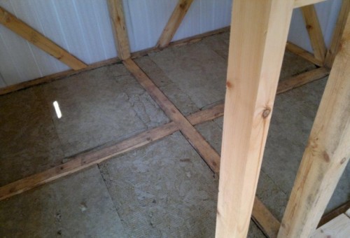 Укладываем минеральную вату на пол, тем самым утепляя его.