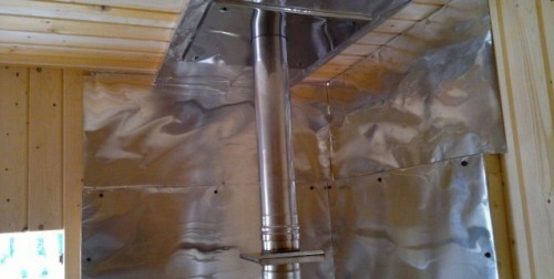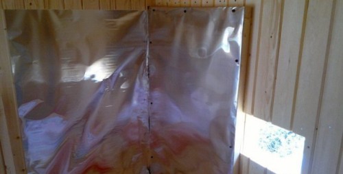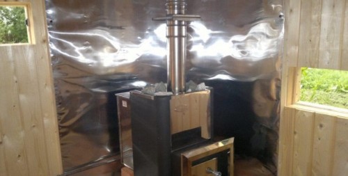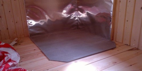 В углу, где будет расположена печь, дополнительно изолируем угол еще одним аналогичным слоем минваты и фольги. Здесь вместо досок просто все затягиваем фольгой, не монтируя вагонку.