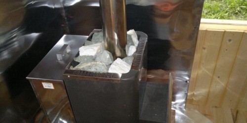 Не забываем в печку подсыпать камней, которые можно будет окатить кипяточком для жаркого пара в сауне.