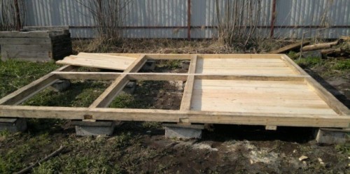 Начинаем зашивать раму пола снизу доской. Перед тем как зашить весь пол предусмотрите отверстие для слива воды. В нашем случае в сауне будет установлен душ, а помывочного отделения как такового не будет, то есть мы предусматриваем лишь одно отверстие в поле, под душем.
