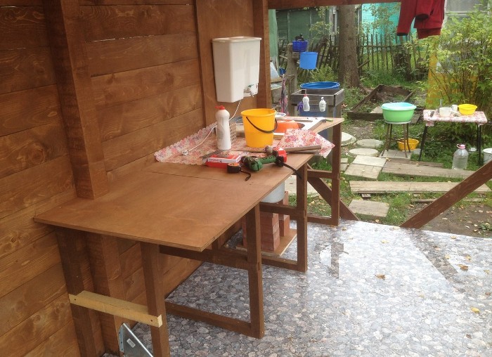Тут же смонтирована умывальник и раковина. Сзади летней кухни выкопан небольшой септик с естественной аэрацией в почву на глубине около 1,5 метров.
