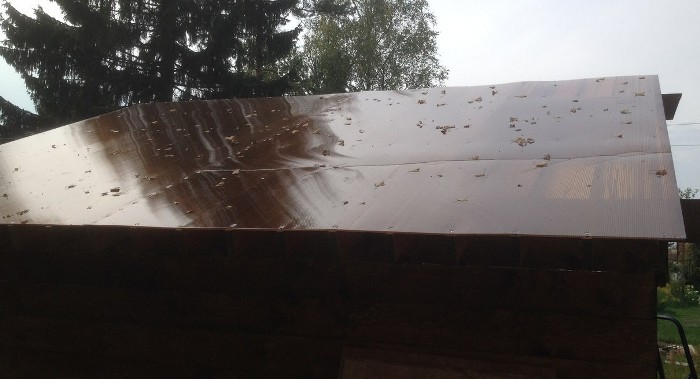 Сразу примеряем лист поликарбоната. И приступаем к покраске дерева.
