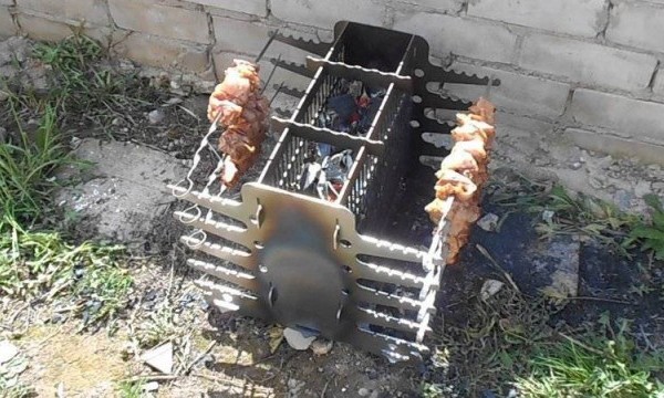 Весьма необычный вариант, так как тепло идет с боку и при этом угли можно подсыпать и подсыпать, не трогая сами шампура.