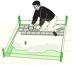 8. Уложите плитку, начиная работу от края здания, не наступая на песок. Для передвижения по уложенной плитке используйте доску, перемещайтесь на коленях. Кладите плитки плотно друг к другу, подгоняя плитки с помощью резинового молотка и доски. При работе старайтесь находиться как можно дальше от последнего уложенного ряда для того, чтобы не ряд плитки не "поплыл".