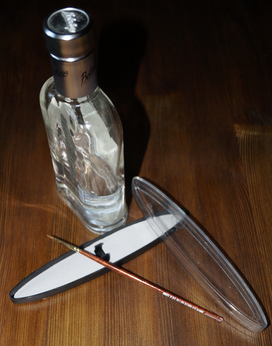 Так вот, кисточка эта в меру жесткая, аккуратная, и удобная. В качестве жидкости использую водку. Да, да, обычную водку. Это не реклама белого вина, а лишь то, что кажется наиболее эффективным. Спирт может быть слишком уж агрессивным, а мыльные, щелочные растворы требуют хорошей промывки водой и тоже могут быть агрессивными. Вот и весь набор, колонковая кисточка смоченная в водке.