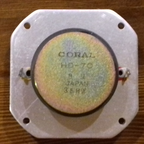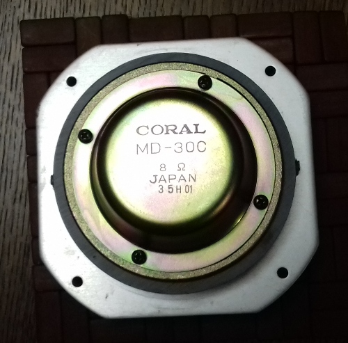СЧ динамик (верхние средние). Вывод с красной подложкой "+". 8 Ом. Частота воспроизведения от 500 Гц до 20 КГц, но по факту работает лишь с сигналом от 4 КГц до 8 КГц (ограничен фильтром).