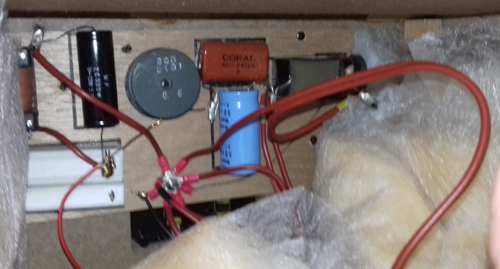 Вся разводка выполнена из меди высокой очистки (бескислородной), 0,18 мм в диаметре, 56 проводников. Однако отрезки идущие на переменное сопротивление скрытое в корпусе другого сечения. Сам по себе корпус довольно тяжелый, даже без динамиков. В корпусе установлены две распорки, одна сразу над НЧ динамиком, крест накрест. Вторая выше СЧ нижнего динамика, но только поперек. Также приклеены накладки дополнительного ДСП высокой плотности по бокам и на задней стенке 15мм и 20 мм.