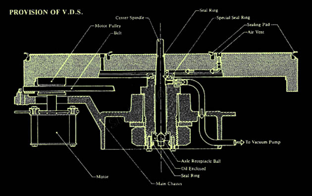 Имеются два уплотнительных ободка, в начале канавок пластинки и в конце. Пластинка укладывается на стабилизатор и чуть прижимается. Далее включается насос, который отсасывает воздух из полости ограниченной пластинкой, уплотнительными ободками и телом самого стабилизатора. В итоге, за счет разницы давления в полости откуда откачивался воздух и атмосферного, пластинка равномерно притягивается к стабилизатору. Это еще один большой плюс такой конструкции, так как по сути прижимная сила действует равномерно распределено, в отличии от клемпа – груза. Кроме того, действие этой силы как раз приложено в нужном месте, то есть там, где и расположены канавки, по которым перемещается игла головки.