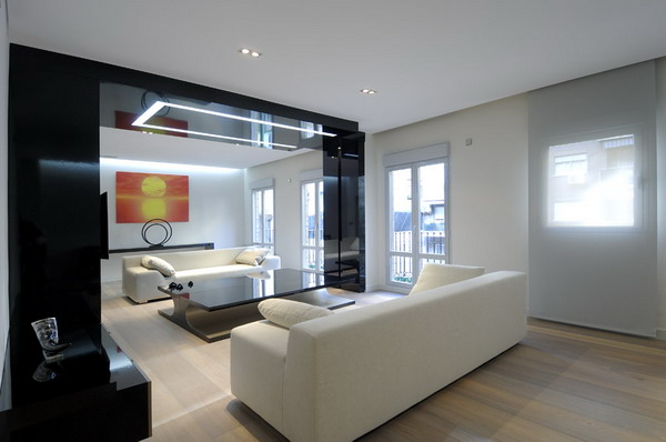 Поскольку гостиная выполняет две основные функции, то и гостиную можно разделить на две зоны – гостевую и семейную. Можно разделить их на строго разграниченные зоны, или использовать «перетекающий» дизайн. К примеру, при использовании первого варианта, гостевая зона, в виде обеденного стола и\или барной стойки ярко освещены и приподняты на небольшой подиум, но стоит спустится с подиума, вы попадаете в мягко освещенную зону с телевизором, мягкими креслами, книжными полками.