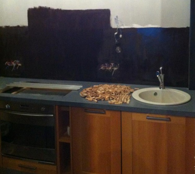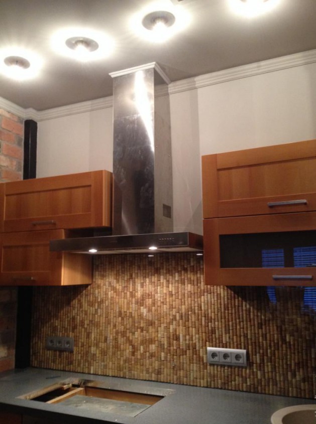 В итоге, после клейки половинок пробок, их предстоит защитить от пыли и тому подобных проявлений враждебной кухонной среды. Как мы уже упомянули, для этого мы установим стекло. Стекло крепиться с помощью анкерных болтов к стене. Далее устанавливаем розетки, выключатели и т.д.