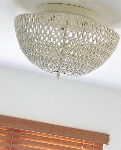 Теперь нам лишь осталось повесить люстру на потолок. При необходимости ее можно покрасить в определенный цвет, под комнату, а также приклеить к ней различную бижутерию, которая «оживит» ее вид.