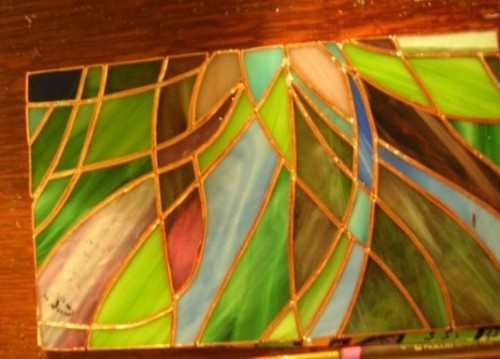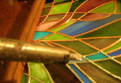 Теперь собираем тот же орнамент, но стекло уже обрамлено медной лентой. Фиксируем витраж между рейками, начинаем пайку.