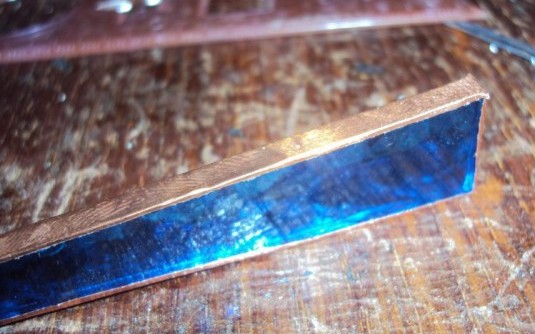После примерки стеклышек начинаем обклеивать каждое из них медной лентой, имеющей с одной стороны самоклеющуюся основу, наподобие монтажного скотча.