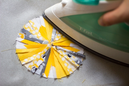 Мы не остановимся на этом и предложим вам еще один вариант. Если вы "дружите" со швейной машинкой, то можно сделать и такой вариант. Берем лоскутки ткани, всего 16 секторов клиновидной формы. Сживаем их в круг, то есть так, чтобы они замкнулись.