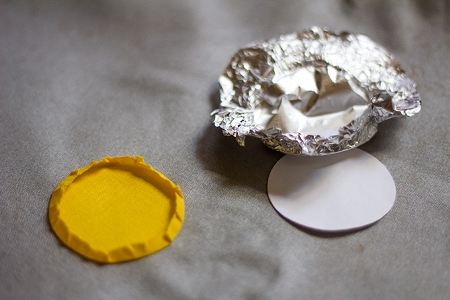 Далее вырезаем серединку. Это кружок из подобной ткани. Фольгу можно применить для прокладки внутри подставки, чтобы подставка лучше держала тепло от кружки.