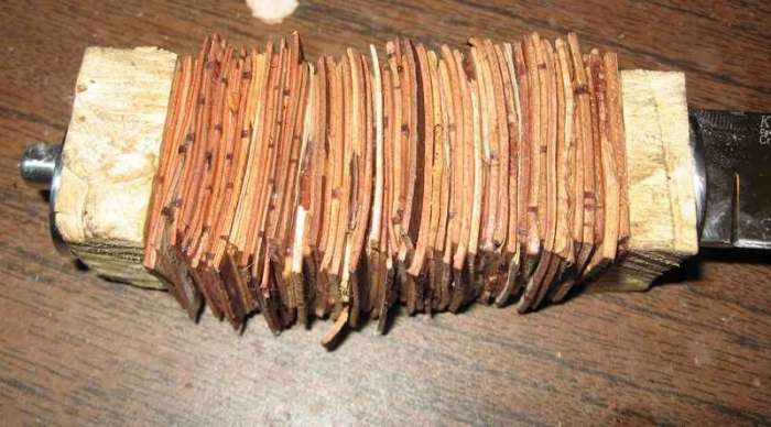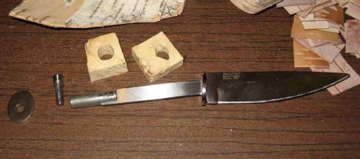 Одеваем все обратно на ручку ножа, теперь устанавливаем ограничивающие шайбы, дерево, бересту и в концовке все также. Закручиваем гайкой и начинаем обрабатывать ручку. Ей необходимо придать форму, чтобы она хорошо лежала в руке.