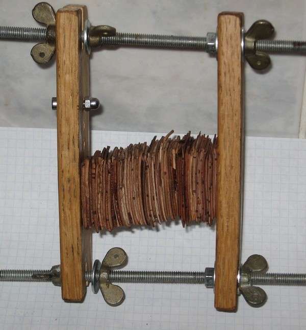 Также можно все одеть на шпильку с двумя шайбами с боков и протянуть всю сборку. Если ваша конструкция выдержит кипячение, то всю сборку вместе с временным удерживающим устройством бросаем в кастрюльку с кипящей водой. Кипятим и вытаскиваем. Вы сами не поверите, как береста приклеиться друг к другу. Из нее выйдет деготь, этот самый природный клей склеит между собой все листы бересты. Теперь ждем высыхания. Клей должен высохнуть окончательно. Здесь понадобиться около суток.