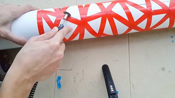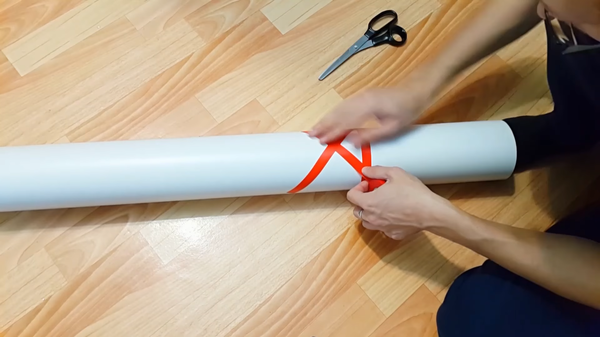 Для того чтобы получилось что-то оригинальное и чтобы свет проходил через трубу, которая первоначально ничего через себя не пропускает, необходимо сделать отверстия. Для этого клеим изоленту. Изолента станет нашими направляющими для прорезания отверстий по ней.