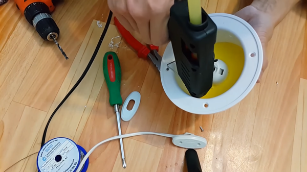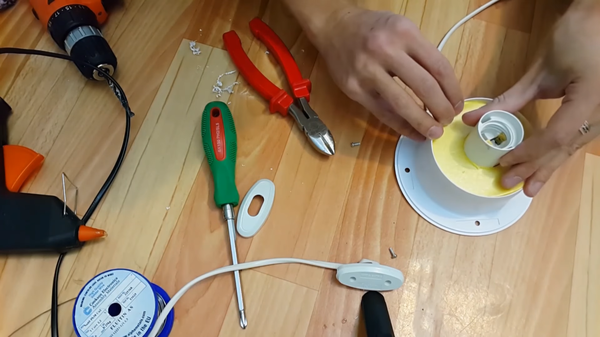 Теперь немного поработаем с основанием. Туда необходимо установить патрон, вклеив его на термоклей. В качестве основания для патрона может подойти любой пластиковый лист, пусть и вырезанный из чего-то сподручного. Пластиковая канистра, бутылка, ящик и т.д.