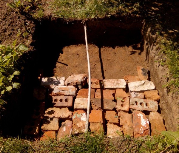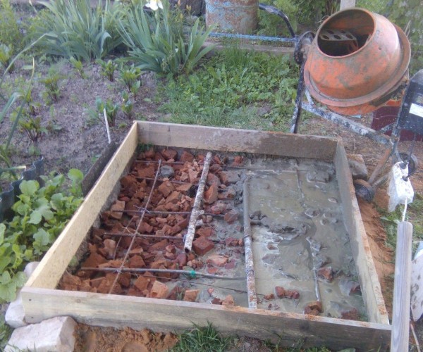 Само собой все начинается с фундамента, даже печки начинаются так! Это самая тяжелая, нудная, не интересная часть мероприятия. Под фундамент копаем яму на 2 штыка лопаты. Плюс ещё усиливаем основание в 2 слоя металлом. Посредине фундамента проходит труба полива участка. Решено не переносить, а залить прямо по ней!