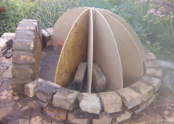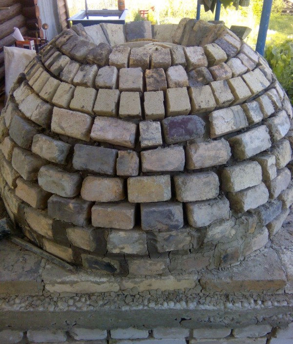 Примерно 2 ряда получалось выложить за вечер, вместе с заготовительными операциями. Постепенно формируем. Чем выше свод - тем труднее и утомительнее. Диаметр меньше, кирпич приходится пилить на 3-4 части, а иногда и тоньше, чтобы перекрыть швы предыдущего ряда.