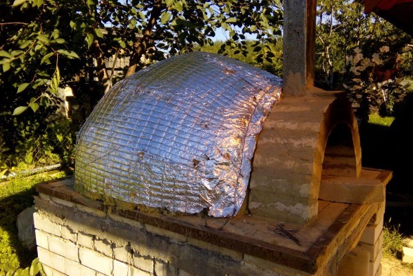 Проявилась первая трещинка у трубы, не страшно, замазал... Начинаем утеплять... На кирпич слой фольги, потом слой минваты, потом опять фольга, затем кладочная сетка. Работать одному не удобно, покрывали в 6 рук (жена и мама помогали). Вот здесь очень помогла обвязка, чтобы кладочная сетка держалась крепко, я по периметру из гвоздей приварил крючки, к ним сетку и натягивал. Вот такой НЛО получился.