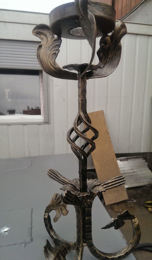 Также были куплены листочки и лепестки, но для них отдельных фотографий не сделано. Собственно из всего этого и делаем подставку светильника. Если вы умеете хорошо варить ручной сваркой, то можно использовать ее. Если же нет, то автоматическая сварка для мелких элементов будет куда сподручнее. Однако здесь надо уже иметь эту самую автоматическую сварку. Получается вот такая стойка для светильника из кованных элементов.