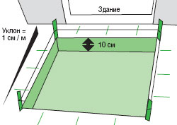 1. С помощью штыковой лопаты или заступа выкопайте грунт на глубину 10 см на участке, предназначенном для укладки плитки. 2. Предусмотрите на поверхности небольшой уклон для стока дождевой воды (1 см на метр).