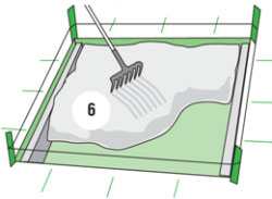 6. Насыпьте песок до уровня реек (минимум 3 - 4 см толщиной) и разровняйте его с помощью грабель. Необходимо насыпать песок с небольшим запасом для того, чтобы скомпенсировать его утрамбовку после укладки плитки.