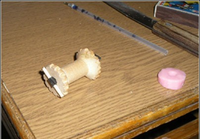 Для игрушки нам понадобиться следующее. Катушка с выступающими краями. Это может быть катушка от ниток, либо от чего-то еще. Необходимо будет кольцевая резинка, спичка, стержень, обмылок или свеча, а может просто пластиковая шайба.