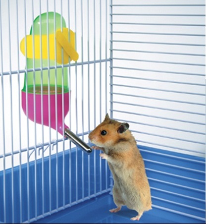 Поилка также нужна. Хотя некоторые хомяков содержат без воды, пологая что жизненно необходимую влагу они пополняют из корма, который едят, но поилку все же необходимо установить. Лучше всего установить поилку-дозатор, которая будет подавать воду по мере потребления этой самой жидкости. Это наиболее экономичный и прагматичный способ напоить хомяка. Обычно это поилки по типу пипетки, когда вода вылизывается из тонкой трубки, сообщенной с емкостью с водой.
