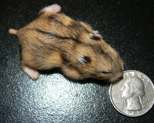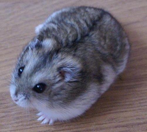 Джунгарские хомячки чуть меньше упомянутых выше и имеют несколько другую раскраску. Они по своей раскраске более похожи на мышь, то есть имеют серую шерстку, иногда с темной полоской на спине. Серый цвет переходит в светло-серый на лапах и на животе. Размер хомячков около 6 см.