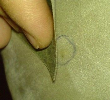 В нашем случае это отверстие на верхней, то есть на ворсистой части. Помечаем место ручкой или маркером, чтобы не потерять местоположение отверстия. Зачищаем ворс с помощью мелкой шкурки. Особо не усердствуем. Не протираем дыру большего размера. Слегка зачищаем.