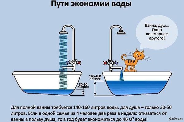 Время от времени принимать душ, вместо ванны. Здесь все ясно, через рассеиватель в душе расход воды значительно ограничен, так что даже за 10-15 минутную процедуру вы способны сэкономить значительный объем воды.