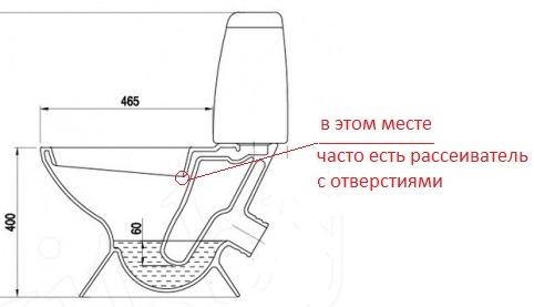 Теперь про сам унитаз, а не про его бачок. Здесь кажется слил 8 литров воды и все смылось, слил 3 литра, не смылось. На самом деле все не так. Здесь важен максимальный объем за короткое время. Время должно быть ограничено лишь тем, чтобы сильно не разбрызгивать воду из унитаза наружу. Все это мы к чему. Если у вас спустится даже 10 литров из бака, но медленно, то этим объемом вы ничего не смоете. А если 5 и быстро, то все может произойти вполне удачно. Скажем сразу, что производитель зачастую грешит такими расчетами и сами унитазы приходится дорабатывать, выбивая спускное отверстие большего размера, чем заложено от производителя.