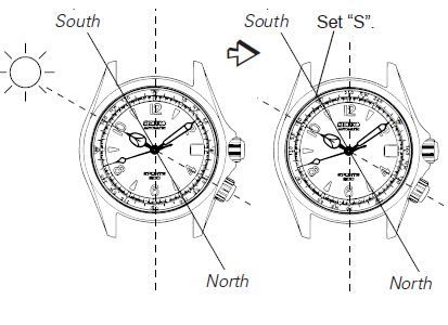 ...то разделенное надвое поле между этими направляющими будет указывать на юг (северное полушарие). Это правило действительно до полудня и после него. Разве что придется делить уже другую половину циферблата. Смотрите выдержку из инструкции часов Seiko.