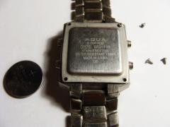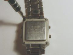 Начнем не с самого распространенного, но вполне возможного варианта. Так крышки с винтами применяются на недорогих электронных часах. Такие крышки обычно не жесткие, и крепятся в 4 точках. А значит, применяются на часах water resist и не более. То есть когда в часах можно лишь мыть руки, но никак не купаться. Пример будет приведен для часов Aqua. В таком же корпусе встречаются и часы QQ, это подразделение Citizen. Так вот, первым делом необходимо «раскрыть браслет», то есть сделать так, чтобы он был разделен на две половины. Это поможет беспроблемно работать с задней стороной часов, то есть демонтировать с них крышку и заменить батарейку. О том как «раскрыть» браслет можно посмотреть в статье «Как отрегулировать, укоротить ремешок на часах».
