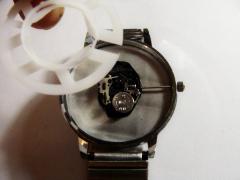 Если вам будут мешать элементы, вроде пластиковой вставки, которая является к тому же и буфером от ударов механизма. То ее можно извлечь, при этом не забудьте ее установить на место при сборке часов.