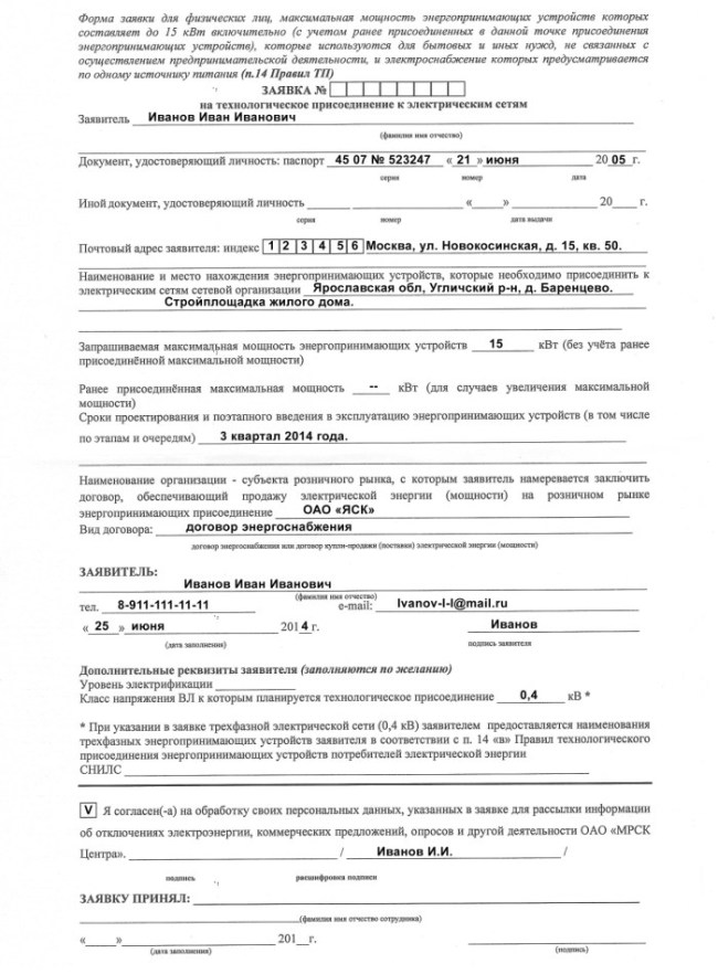 В итоге там мне сообщили, что необходимо подъехать и заполнить заявку на технологическое присоединение к электрическим сетям. При этом при себе для заполнения заявки необходимо иметь следующие документы: