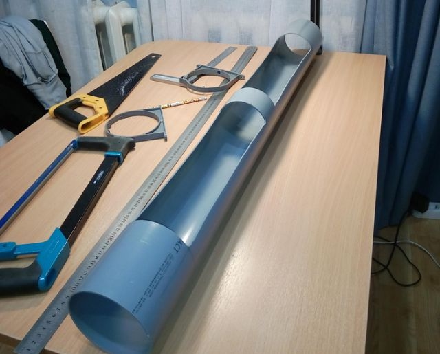 Да, да, в нашем случае мы предлагаем вам применить обычную канализационную трубу из пластика. Труба достаточно жесткая, чтобы ее нагрузить проводами. Для нее в магазине имеются стандартные крепления, которые можно применить для ее фиксации к стене или крышке стола. Ну а уж где и как вырезать отверстия в такой трубе это дело ваше. То есть можно вырезать окошка в нужном месте и под выход нужных штекеров. В нашем случае это два "окна".